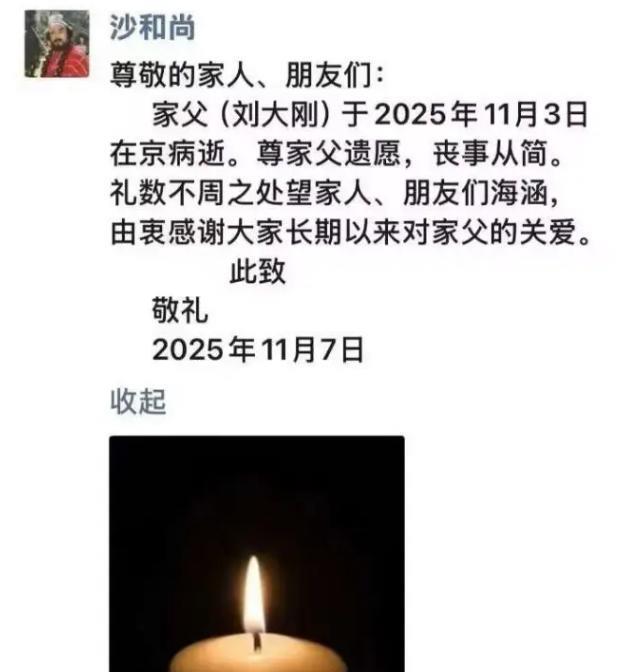[免责声明]文章的时间、过程、图片均来自于网络,文章旨在传播正能量,均无低俗等不良引导,请观众勿对号入座,并上升到人身攻击等方面。观众理性看待本事件,切勿留下主观臆断的恶意评论,互联网不是法外之地。本文如若真实性存在争议、事件版权或图片侵权问题,请及时联系作者,我们将予以删除 信息来源: 百度百科:刘大刚个人资料 沙僧扮演者刘大刚病逝家属:将遵照遗愿从简治丧.光明网 著名男演员刘大刚去世,曾在《西游记续集》出演沙僧.成都商报 著名表演艺术家刘大刚因病去世!曾出演《西游记》“沙僧”.搜狐娱乐